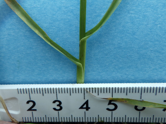 葉耳は見られず、葉舌は切形で短く葉身は二つ折り、横走する長い根茎の節から株を出しています。