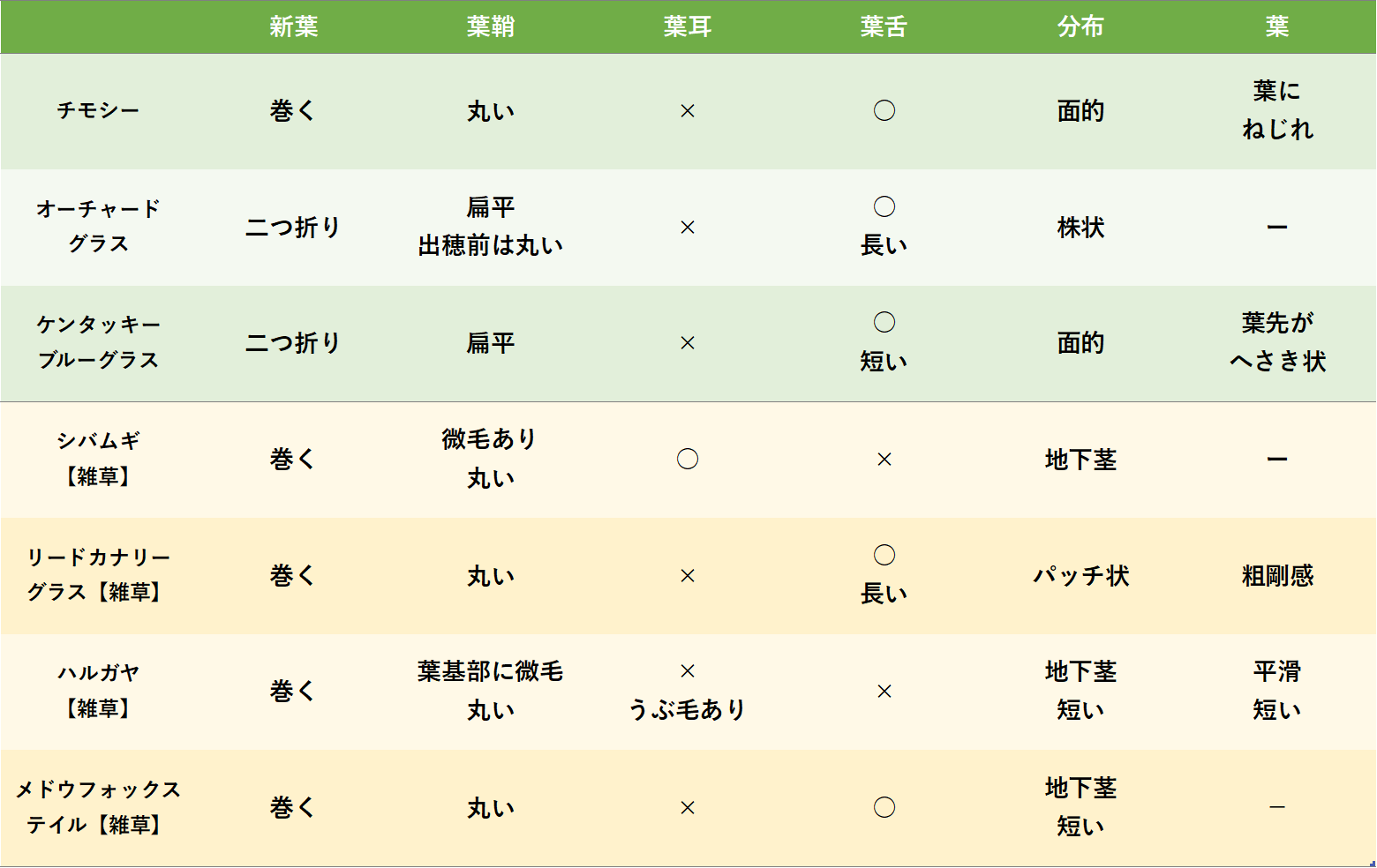 【葉の形態】葉巾の違い、葉がねじれ、葉の折れ目の有無などによって、草種間で違いがあります。