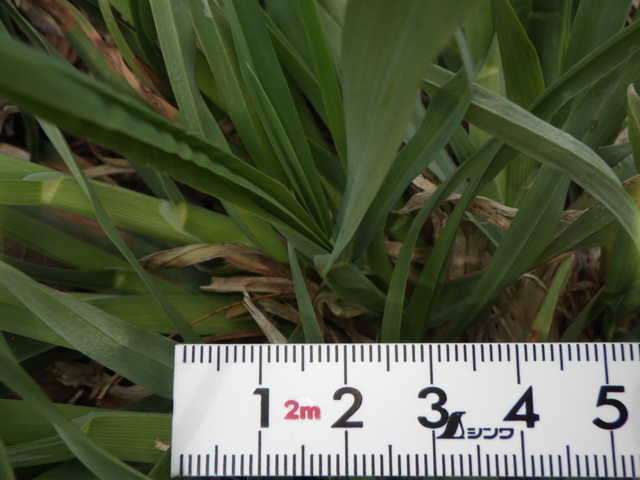 葉舌はなく葉耳が半面にくっつくようになっています。葉身は二つ折りまた、シバムギのような微毛はなく葉も直立しています。