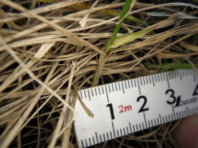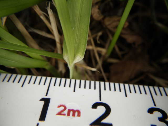 葉耳は見られず、葉舌は切形で短く葉身は二つ折り、横走する長い根茎の節から株を出しています。