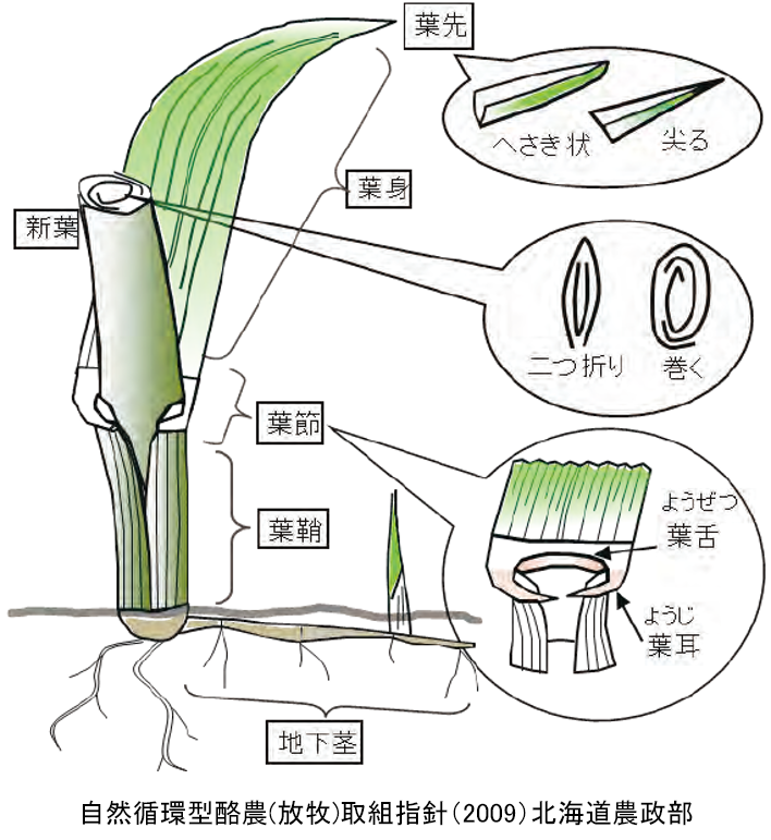 【葉の形態】葉巾の違い、葉がねじれ、葉の折れ目の有無などによって、草種間で違いがあります。