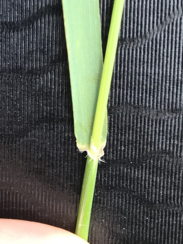 葉耳はありません。長い葉舌があり、やや尖っています。葉身の付け根から葉耳にかけて毛があり、他の草種と判別することができます。